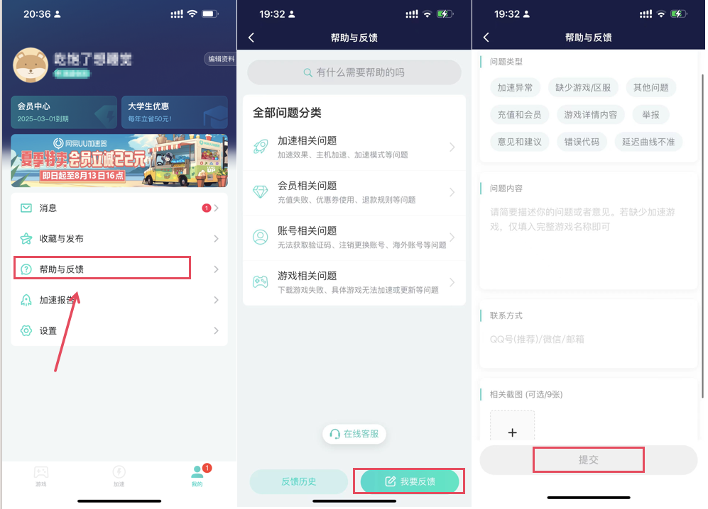 登录UU加速器/主机加速App-我的-帮助与反馈-我要反馈-选择问题类型,描述问题提交即可