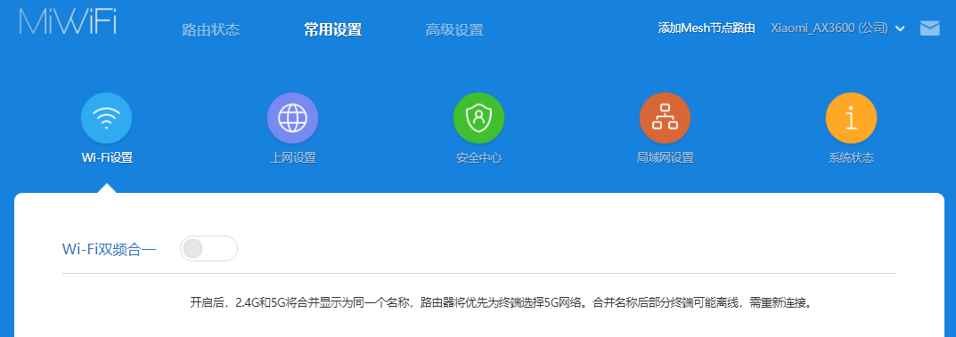 以小米路由器为例,点击【Wi-Fi双频合一】功能按钮进行关闭。