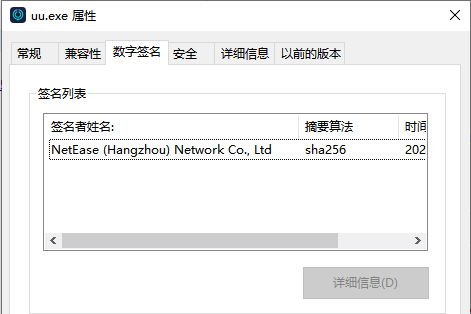 检查方式:打开任务管理器,选中网易UU加速器运行程序-右键-属性-数字签名-双击签名人姓名,如果签名人信息中的名称显示“