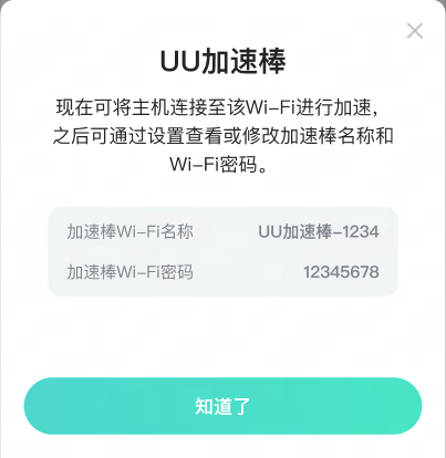 4.连接完成后,首次使用会提示UU加速棒的Wi-Fi名称及密码:
